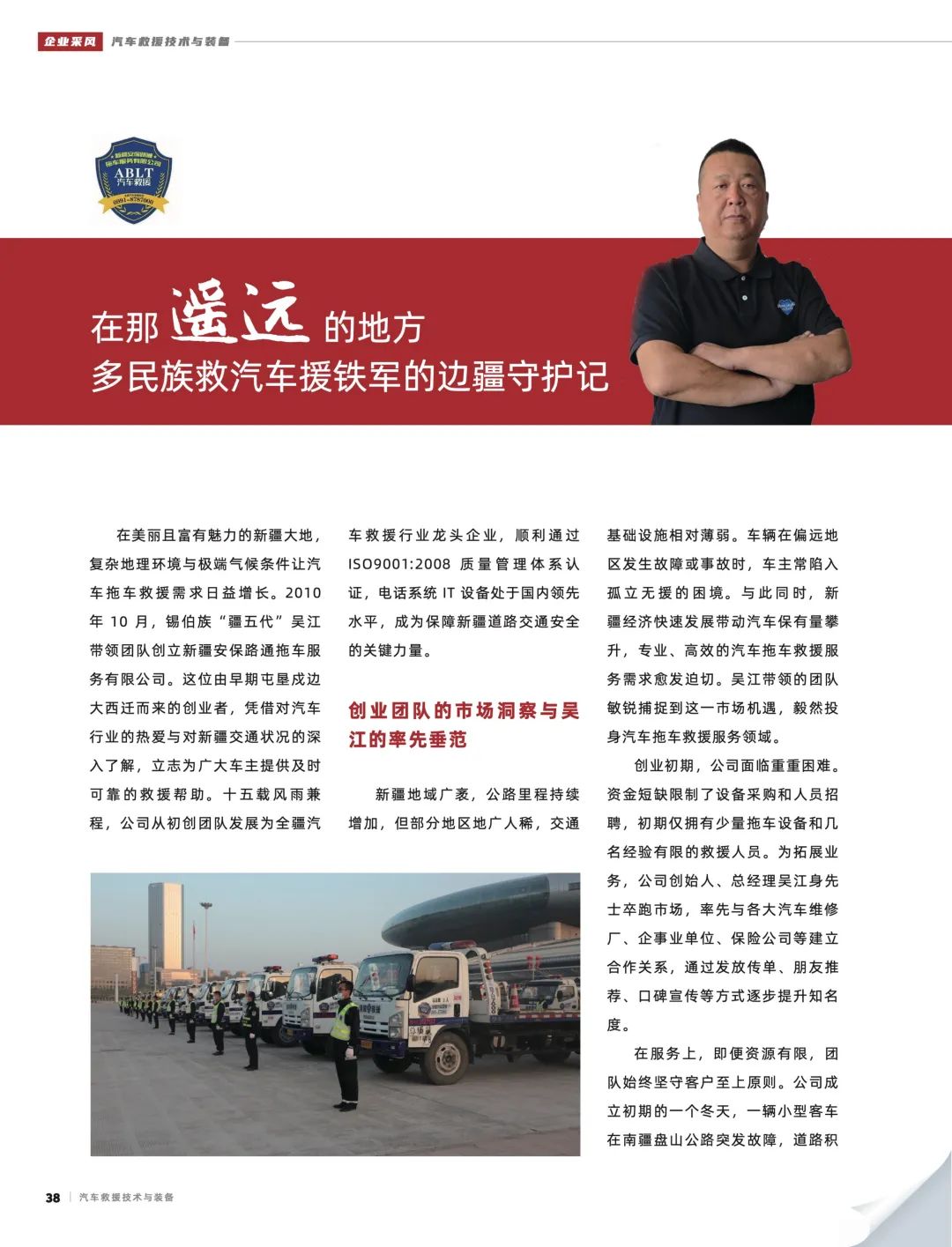 在美丽且富有魅力的新疆大地,复杂地理环境与极端气候条件让汽车拖车救援需求日益增长。2010 年 10 月,锡伯族“疆五代”吴江带领团队创立新疆安保路通拖车服务有限公司。这位由早期屯垦戍边大西迁而来的创业者,凭借对汽车行业的热爱与对新疆交通状况的深入了解,立志为广大车主提供及时可靠的救援帮助。十五载风雨兼程,公司从初创团队发展为全疆汽车救援行业龙头企业,顺利通过 ISO9001:2008 质量管理体系认证,电话系统 IT 设备处于国内领先水平,成为保障新疆道路交通安全的关键力量。