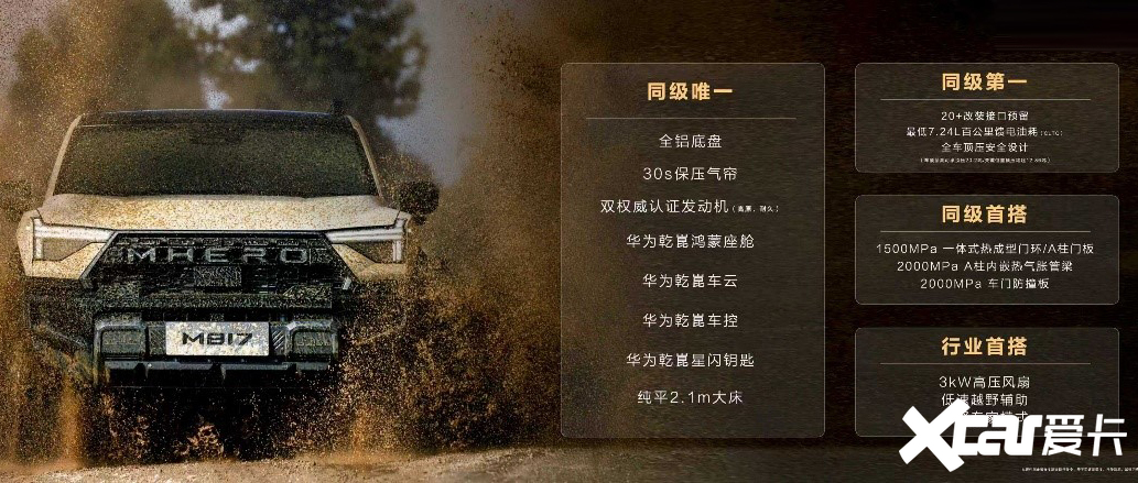 M817 Hero版作为家族新成员,搭载专属MHERO格栅和越野型保险杠,造型威猛。极猛动力、智能越野全地形系统、战甲车身等黑科技赋予其全域通达能力,标配的3把锁让脱困能力更强。新车还配备同级唯一的鸿蒙座舱、华为乾崑鲸鳍通信和卫星电话,即便在无人区也不会断网失联。