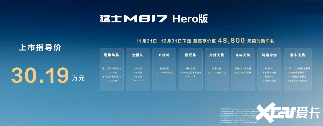 猛士汽车在广州车展发布了全新M817 Hero版,售价30.19万元,今年12月31日前下定M817 Hero版的用户,还可享价值48,800元限时礼遇。这款被称为“越野改装玩家”的新车,不仅在越野性能上再度升级,更以超强的拓展性满足深度改装需求。