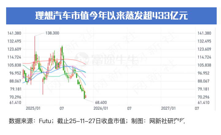 截止25年11月27日,理想汽车美股收盘价为18.4美元,港股收盘价为71.8港元,公司市值今年以来蒸发近433亿人民币。