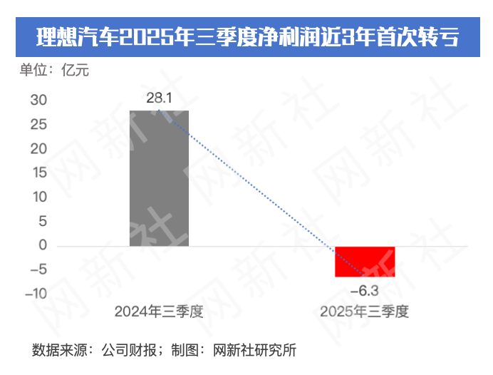 网新社研究所:近日,理想汽车公布了2025年第三季度的财报。数据基本在投行分析师预期内,总体而言不太乐观。公司三季度营收为273.6亿元,比去年同期下滑了36%,主要是受卖车收入下滑拖累。公司三季度汽车交付量为9.32万辆,较去年同期的15.3万辆,下滑39%。更引人关注的是,理想汽车三季度净利润亏损6.3亿元,是近三年来首次出现单季亏损。
