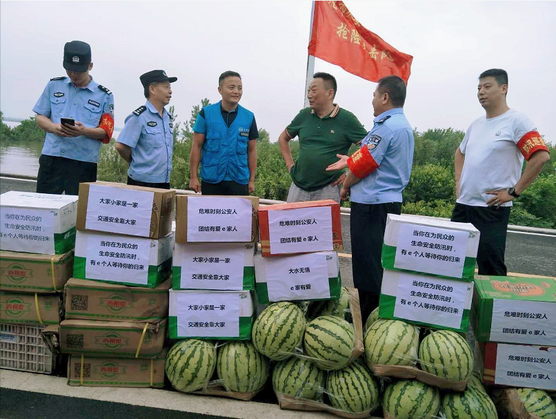 2020年7月19日,e代驾九江分公司的志愿者在九江市公安局的指导下,前往堤坝上慰问一线防汛公安人员,为他们送去矿泉水、西瓜等补给物资,支持防汛工作。