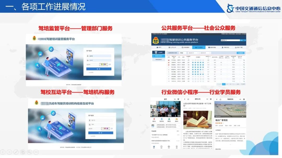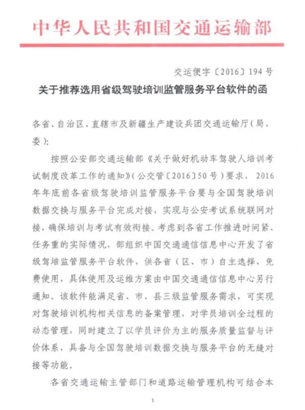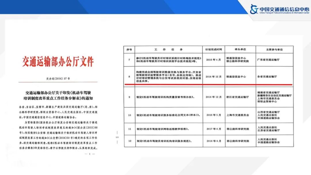 为落实《国务院办公厅转发公安部交通运输部关于推进机动车驾驶人培训考试制度改革意见的通知》(国办发〔2015〕88号) 要求,根据《公安部、交通运输部关于做好机动车驾驶人培训考试制度改革工作的通知》(公交管〔2016〕50号)及交通运输部驾驶员培训制度改革重点任务分工安排,中国交通通信信息中心承担了《机动车驾驶员计时培训系统技术规范》修订、省级驾驶培训监管服务平台建设、全国驾驶培训数据交换与服务平台建设以及与公安部考试预约系统对接技术支持工作。