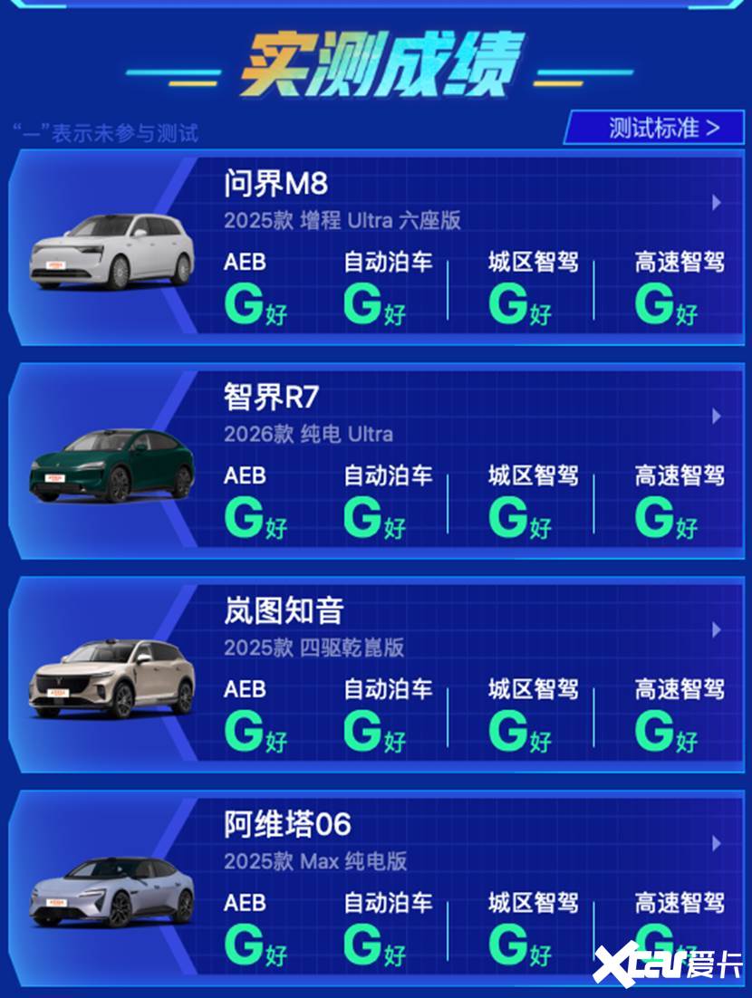 这四款车型在 AEB、城区辅助驾驶、泊车辅助、高速辅助驾驶四大核心维度的所有细分项目中,均展现出断层领先的综合实力: