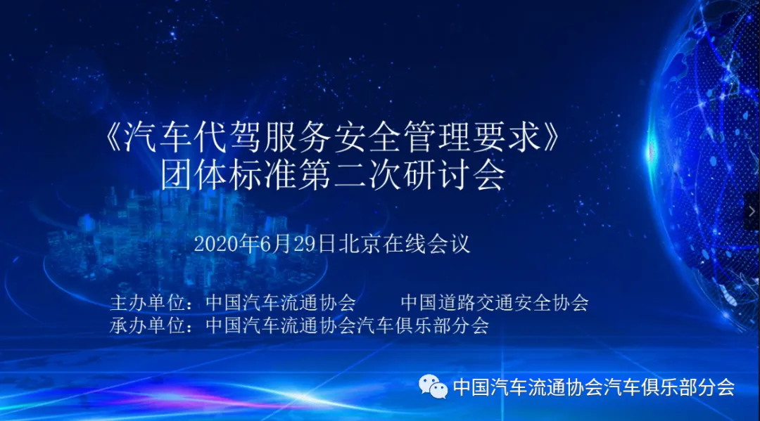 2020年6月29日,中国汽车流通协会与中国道路交通安全协会共同组织召开了第二次《汽车代驾服务安全管理要求》(以下简称要求)团体标准研讨会,会议采用网络在线召开方式进行。