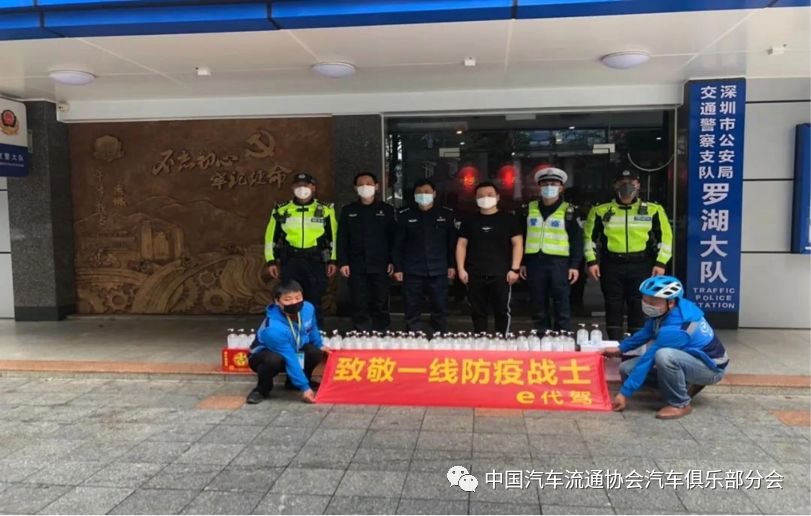 组成志愿者团队,为深圳罗湖区交警支队罗湖大队南湖中队送去酒精洗手液、食品等防疫物资。