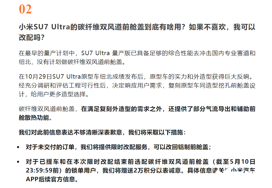 在SU7 Ultra上需要花4.2万元选装的“碳纤维前舱盖”,车主实测其散热性和空气动力学性能与普通金属前盖无异。面对集体维权诉求,小米推出“60天冷静期”政策,大概意思是:想退的,车辆我们暂停生产,原来预计的交付周期作废,定金不退。如果之后您改变主意想继续提车,需要在60天内,联系我们。